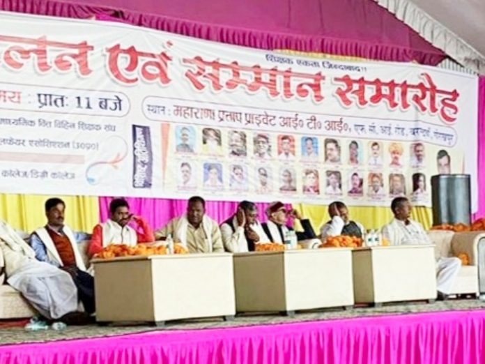 गोरखपुर। उत्तर प्रदेश माध्यमिक वित्तविहीन शिक्षक संघ एवं प्राइवेट आईटीआई वेलफेयर एसोसिएशन उत्तर प्रदेश के संयुक्त तत्वाधान में शनिवार को बरगदवा में शिक्षक सम्मान समारोह का आयोजन किया गया। गोरखपुर – फैजाबाद मंडल के सभी जिलों के प्रबंधक एवं प्रधानाचार्य उपस्थित रहे। संघ के प्रदेश अध्यक्ष और सम्मेलन के मुख्य अतिथि ओमप्रकाश बागी ने लोगों को संबोधित करते हुए कहा कि उत्तर प्रदेश सरकार, माध्यमिक शिक्षा में गैर बराबरी का मॉनदण्ड अपना रही है। कठिन परिश्रम करके माध्यमिक शिक्षा को बुलंदी तक पहुंचाने वाले प्रिंसिपल, शिक्षक और कर्मचारियों के पदों का सृजन ना करके सरकार ने शिक्षकों को गुलाम बना दिया है। जो बच्चों को अच्छी शिक्षा देकर देश का मान- सम्मान बढ़ा रहा है, वही शिक्षक अभाव के कारण अपनी रोजमर्रा की चीजों की व्यवस्था नहीं कर पा रहा। शिक्षकों आवाज विधान परिषद में गूंजे , इसके लिए संघ ने गोरखपुर- फैजाबाद शिक्षक निर्वाचन क्षेत्र से शिक्षक विधान परिषद प्रत्याशी के रूप डॉक्टर पुरुषोत्तम कुमार यादव को मजबूती से खड़ा किया है।
