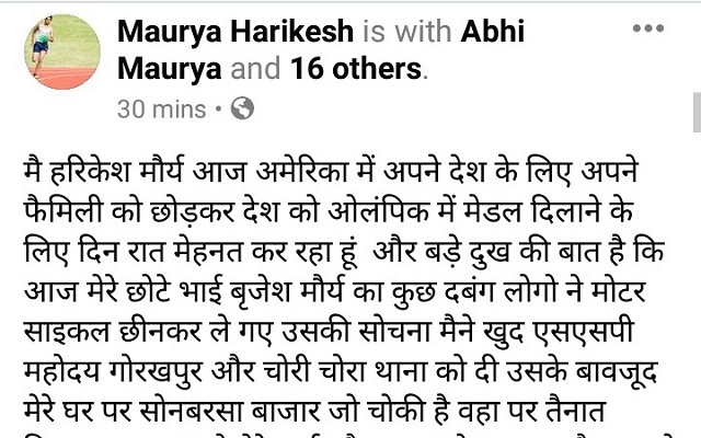 गोरखपुर। अमेरिका में ओलंपिक खेलों की तैयारी कर रहे धावक हरिकेश मौर्या के बड़े भाई बृजेश मौर्या की पिटाई और उनके पिता संग बदसलूकी पर एसएसपी ने कार्रवाई की है। पिता और भाई संग पुलिस चौकी में खराब व्यवहार की शिकायत धावक हरिकेश मौर्या ने ट्वीट करके की। आनलाइन शिकायत मिलते ही एसएसपी डा. सुनील गुप्ता ने सोनबरसा बाजार चौकी इंचार्ज विशाल शुक्ला को लाइन हाजिर कर दिया। पिटाई के आरोपों को लेकर विभागीय जांच का निर्देश सीओ चौरीचौरा रचना मिश्रा को दिया।