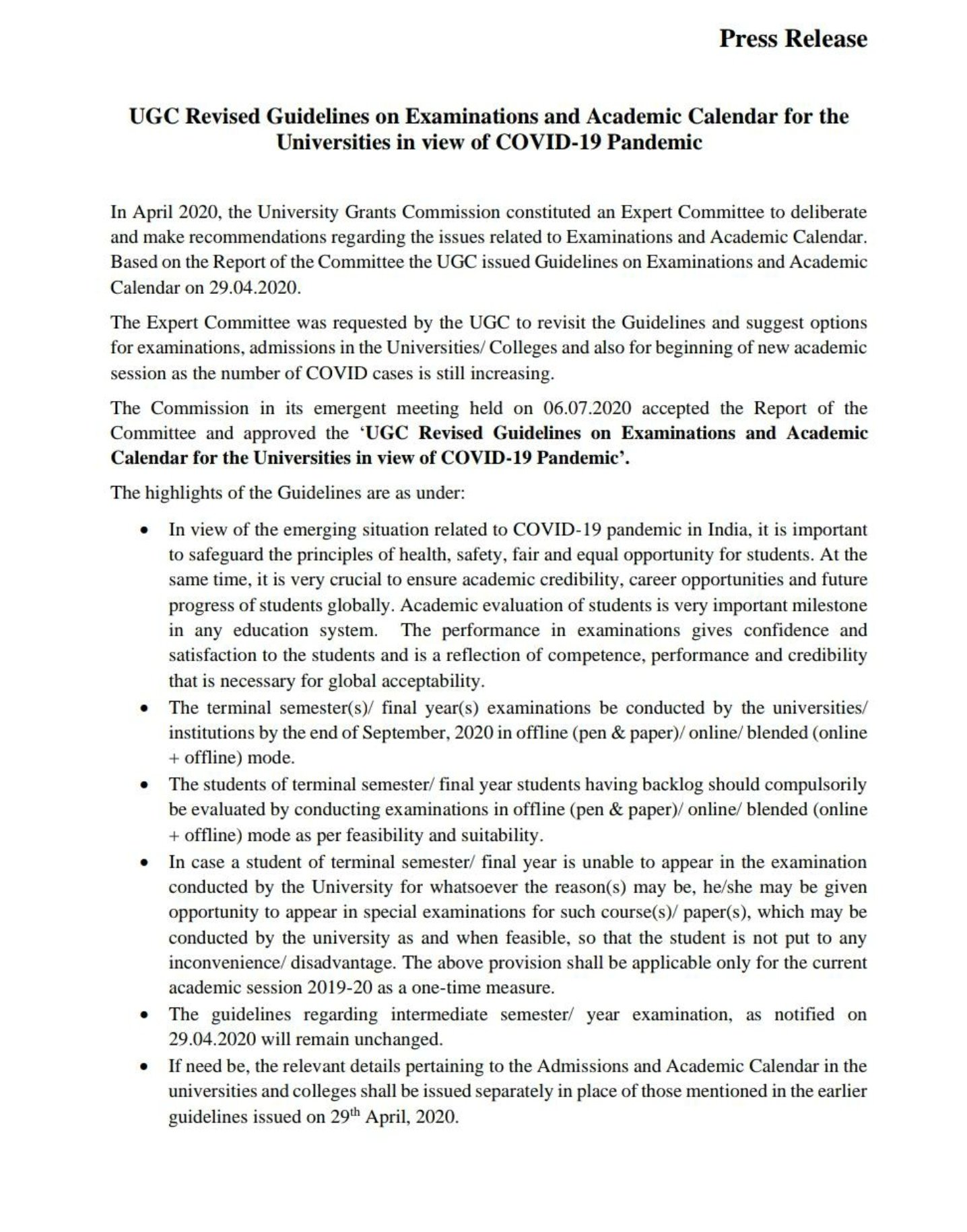 परीक्षा के दौरान स्वास्थ्य मंत्रालय की ओर से जारी स्टैंडर्ड ऑपरेटिंग प्रॉसीजर का पालन करना एकदम ज़रूरी होगा। बयान में यह भी कहा गया है कि एग्जाम के संबंध में यूजीसी और विश्वविद्यालयों के एकेडिमक कैलेंडर के दिशा-निर्देशानुसार और केंद्रीय स्वास्थ्य एवं परिवार कल्याण मंत्रालय से मंजूर मानक संचालन प्रक्रिया (एसओपी) के अनुसार सालाना परीक्षाएं अनिवार्य रूप से आयोजित कराई जानी हैं। यूजीसी की नई गाइड लाइंस के अनुसार, विश्वविद्यालयों/शैक्षिक संस्थाओं में स्नातक और परास्नातक की फाइनल ईयर/सेमेस्टर की परीक्षाएं सितंबर 2020 अंत तक आयोजित की जाएंगी।