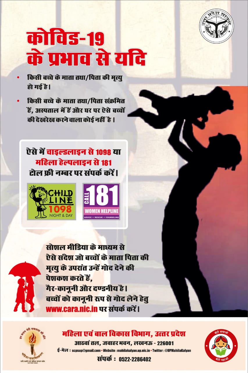 कोरोना काल में जिन बच्चों ने अपने माता-पिता दोनों या किसी एक को खो दिया है, उनके बारे में कोई भी व्यक्ति चाइल्ड लाइन के हेल्पलाइन नम्बर-1098 या महिला हेल्पलाइन-181 पर सूचना दे सकता है। ऐसे बच्चों को चाइल्ड लाइन 24 घंटे के अन्दर बाल कल्याण समिति के समक्ष प्रस्तुत करेगी। बच्चों की सूचना राष्ट्रीय बाल अधिकार संरक्षण आयोग के हेल्पलाइन- 011-23478250 पर भी दी जा सकती है ।