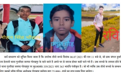 गोरखपुर। गुलरिहा थाना क्षेत्र के जंगल डुमरी नंबर दो के हेलानी टोला के रहने वाले तीन नाबालिग बच्चे आनलाइन गेम खेलने से रोकने पर नाराज होकर भाग गए। उनके लापता होने की सूचना परिजनों ने पुलिस को दी। तीनों बच्चों की तलाश के लिए पुलिस ने सोशल मीडिया पर फोटो वायरल किया है। बच्चों के बारे में सूचना देने वालों को एसएसपी दिनेश कुमार पी ने पुरस्कृत करने की घोषणा की है।
